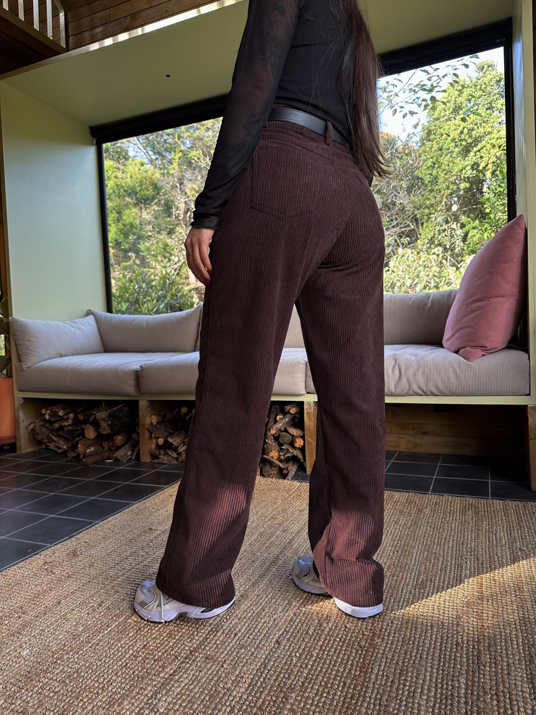 $113.000Pant tiro alto, color café oscuro, elaborado en corduroy, tiene bolsillos laterales y traseros, la bota es ancha, es una prenda básica, versatil y super cómodo. Su fit es amplio.