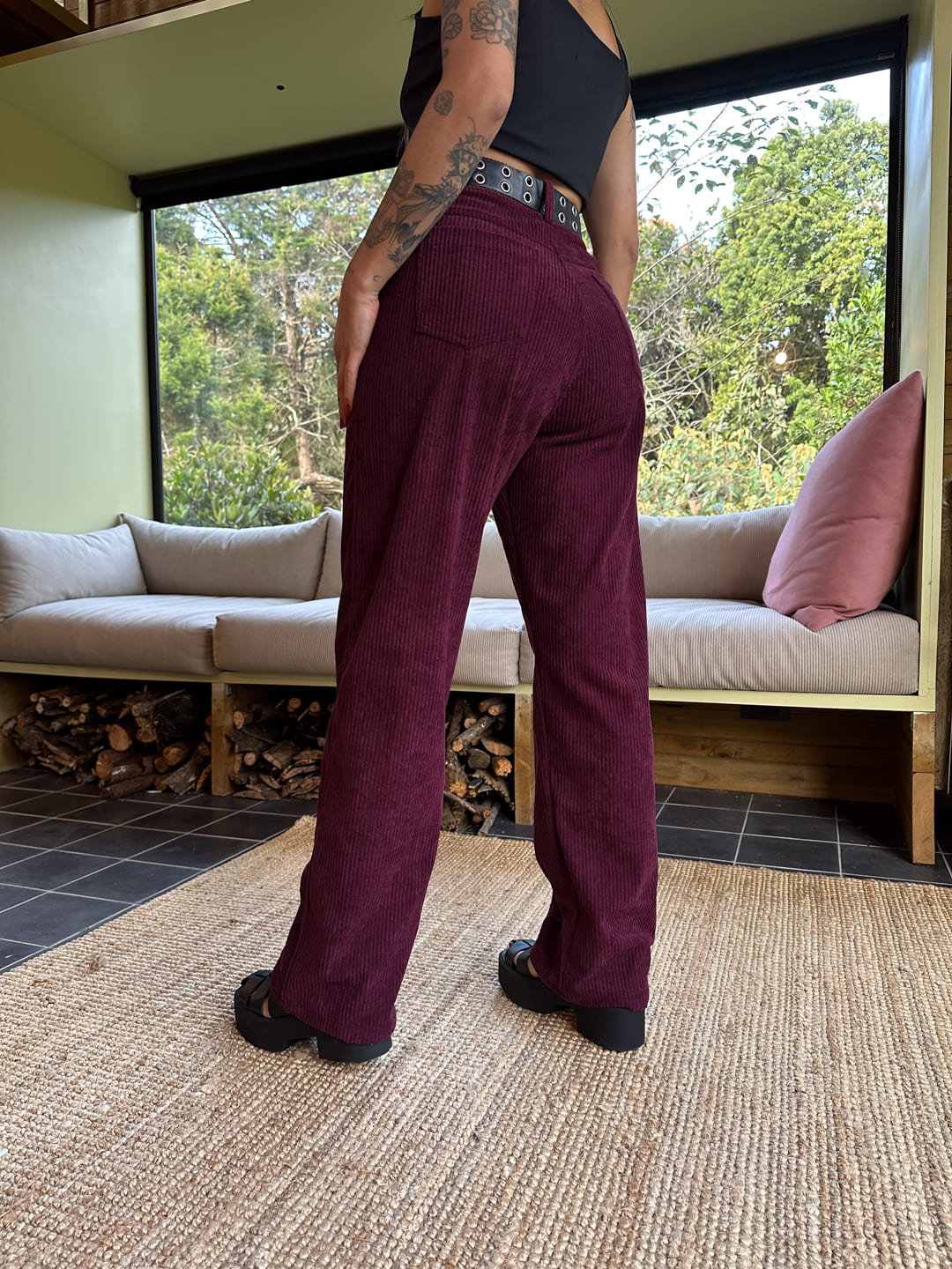 $113.000Pant tiro alto, color vinotinto, elaborado en corduroy, tiene bolsillos laterales y traseros, la bota es ancha, es una prenda básica, versátil y super cómodo. Su fit es amplio.