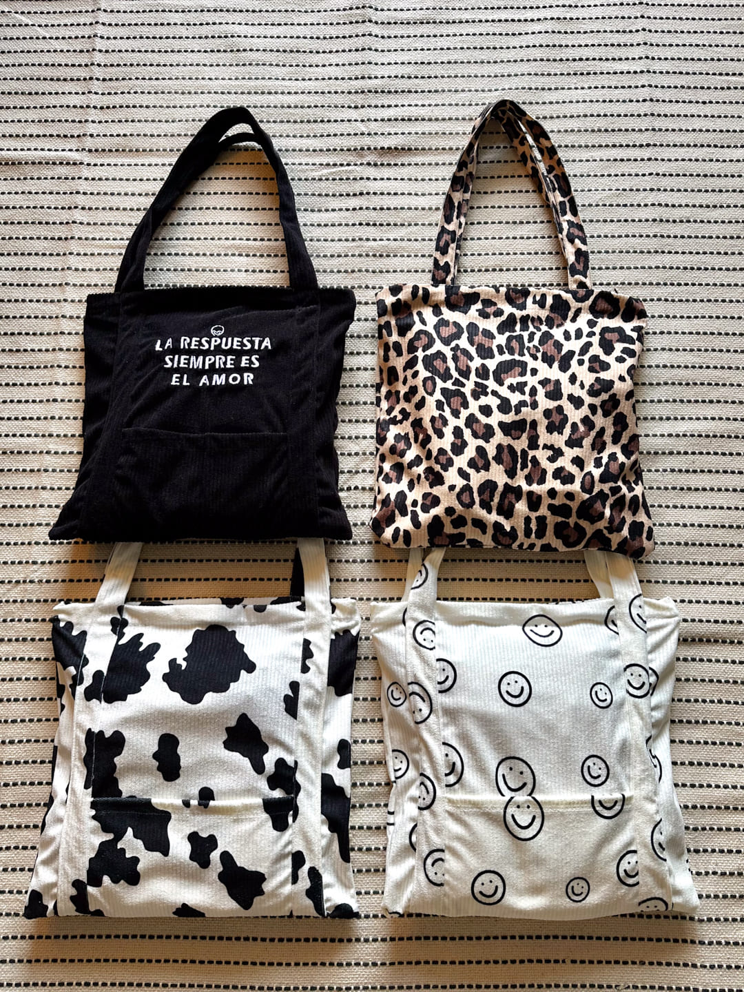 $75.000Esta tote bag es el accesorio perfecto y con estilo que buscabas, es practica y segura. Cuenta con cierre lo que hace que sea mas segura, tiene un bolsillo interno pequeño. Su print de leopardo la hace muy cool, hicimos pocas unidades :). Esta elaborada en corduroy.