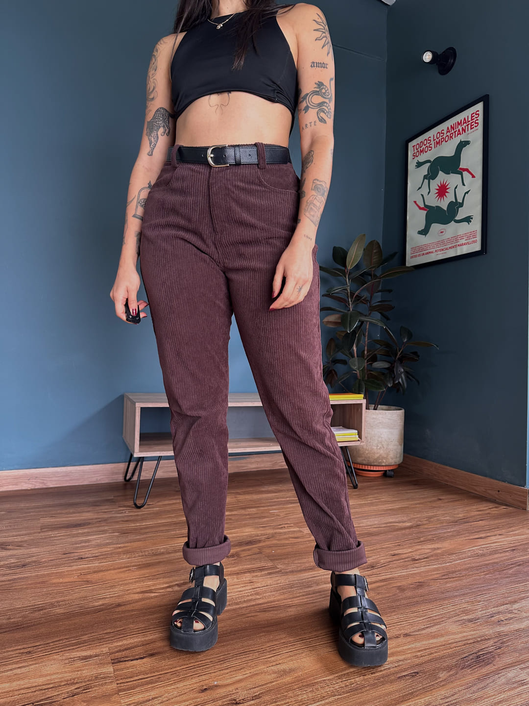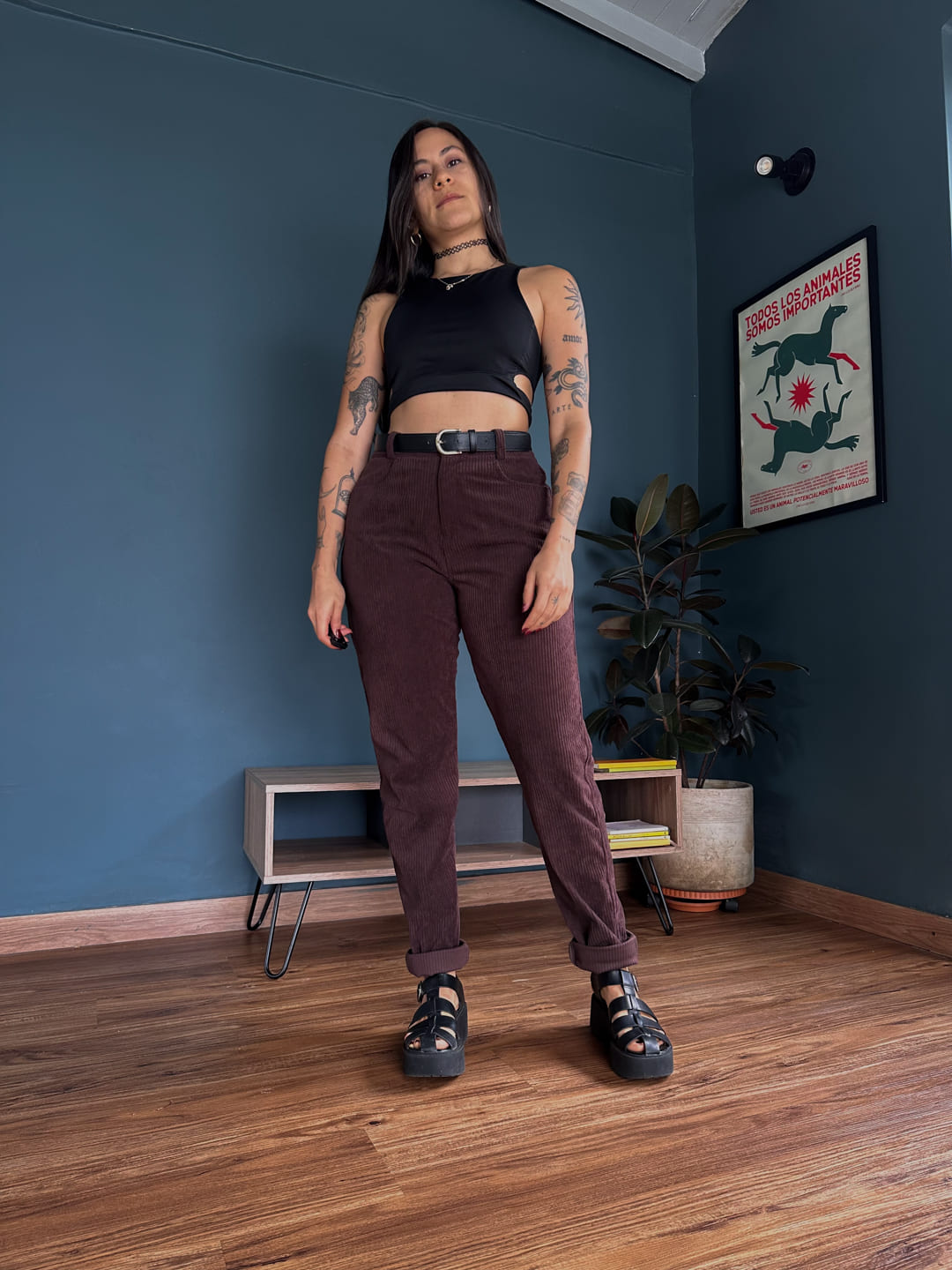 Pant tiro alto, color chocolate, elaborado en corduroy, tiene bolsillos delanteros y traseros, es una prenda básica fácil de combinar y super cómodo.