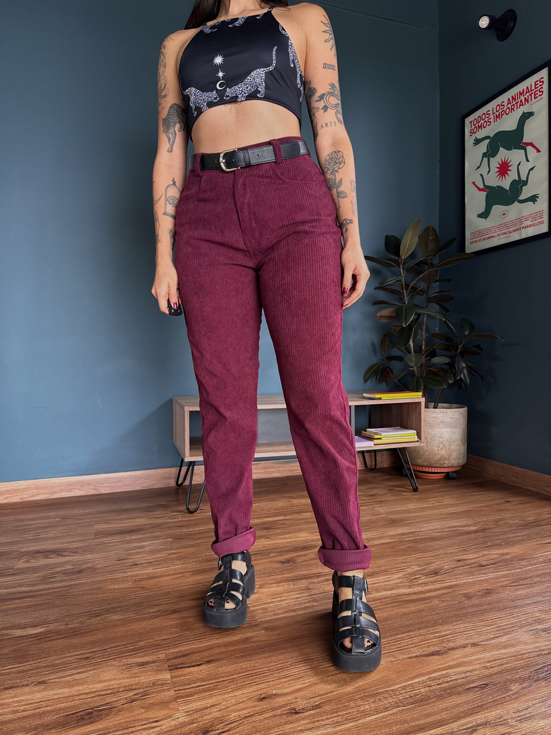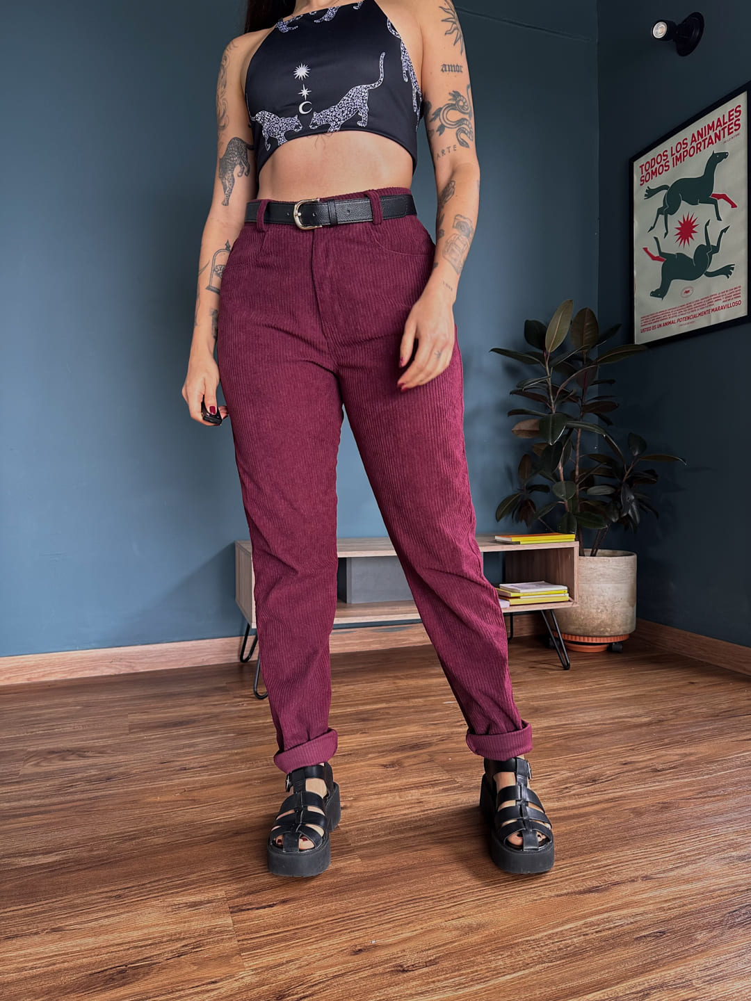 Pant tiro alto, color vino, elaborado en corduroy, tiene bolsillos delanteros y traseros, es una prenda básica fácil de combinar y super cómodo.