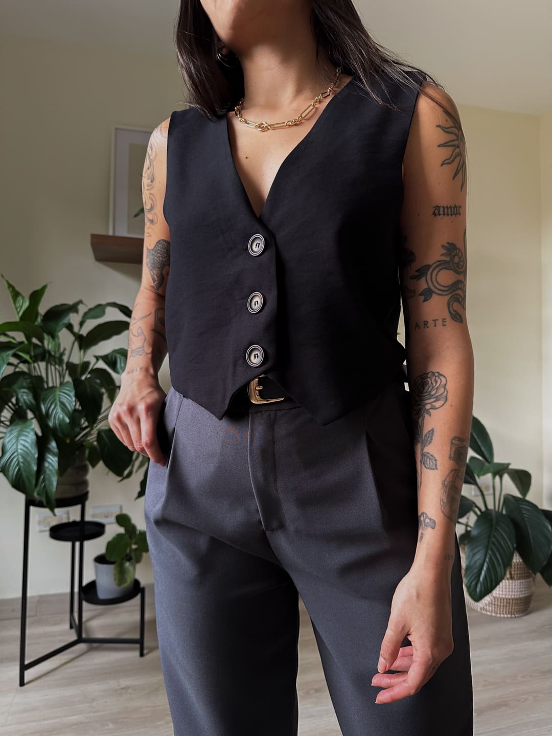 Chaleco negro tipo sastre corto, elaborado en poliester, forrado por dentro en frente y espalda, tiene 3 botones en el frente, es una prenda básica, fácil de combinar, la tela es rígida, suave y cómoda.