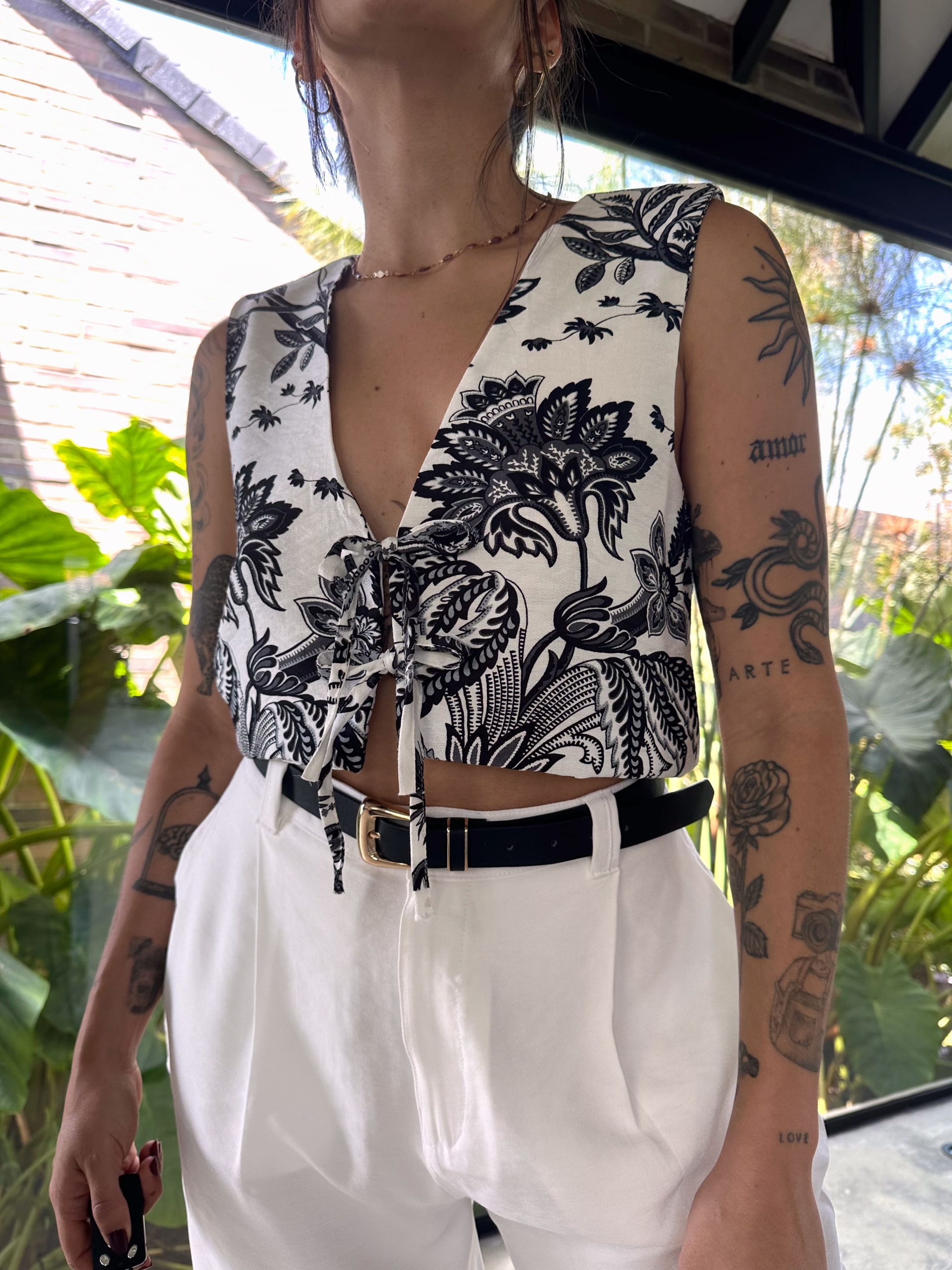 Chaleco blanco con print de flores negras, tiene tiras en la parte delantera para ajustar, doble en frente y espalda, elaborado en poliester. Es una prenda básica fácil de combinar, super cómoda y versátil.