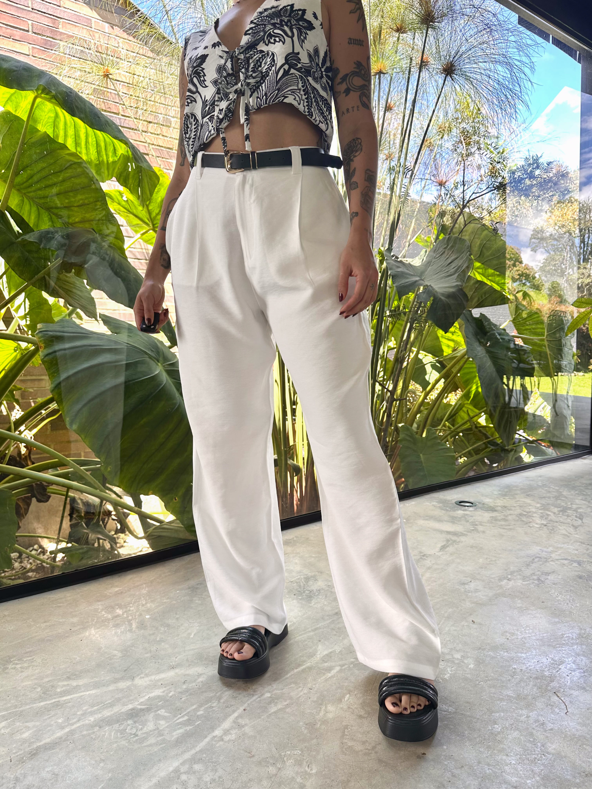 Pant tiro alto, color blanco, elaborado en rayon y poliester, tiene bolsillos laterales y traseros, tiene la bota ancha, es una prenda básica fácil de combinar, su fit es amplio y super cómodo. La tela tiene poca elasticidad