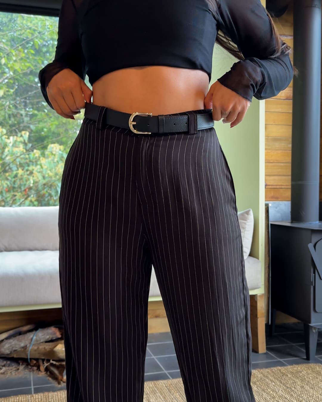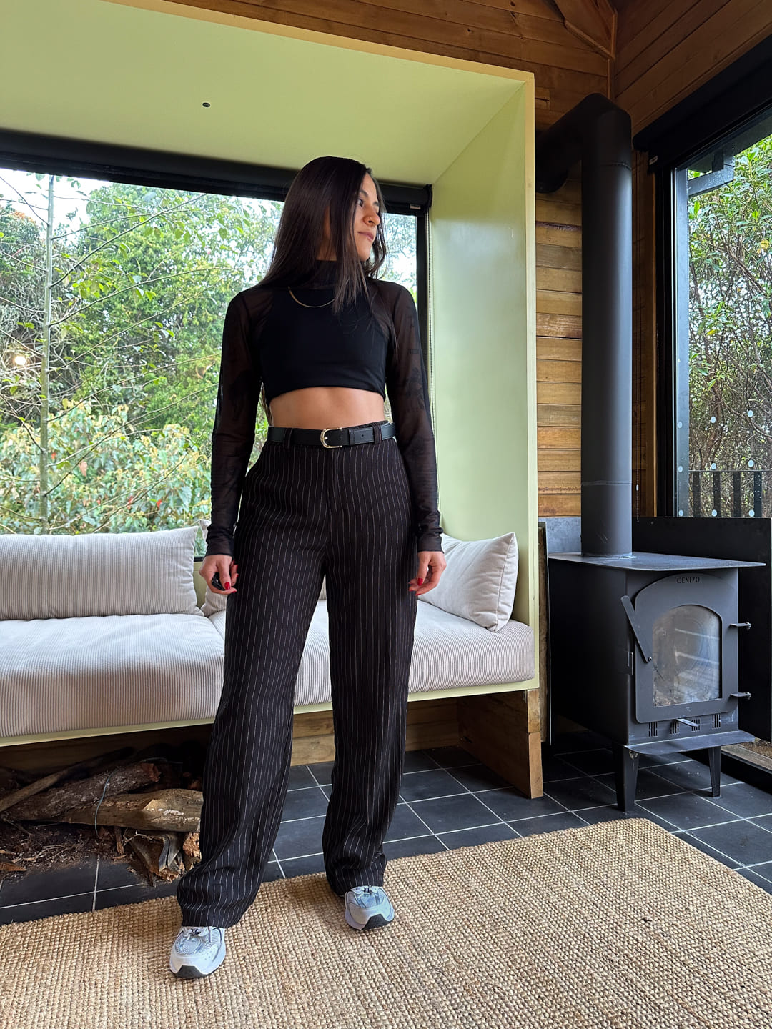 Pant tiro alto, color negro con rayas blancas, elaborado en poliester, tiene bolsillos laterales, la bota es ancha, es una prenda básica fácil de combinar y super cómodo. Su fit es amplio. La tela tiene una buena caída y es fresca