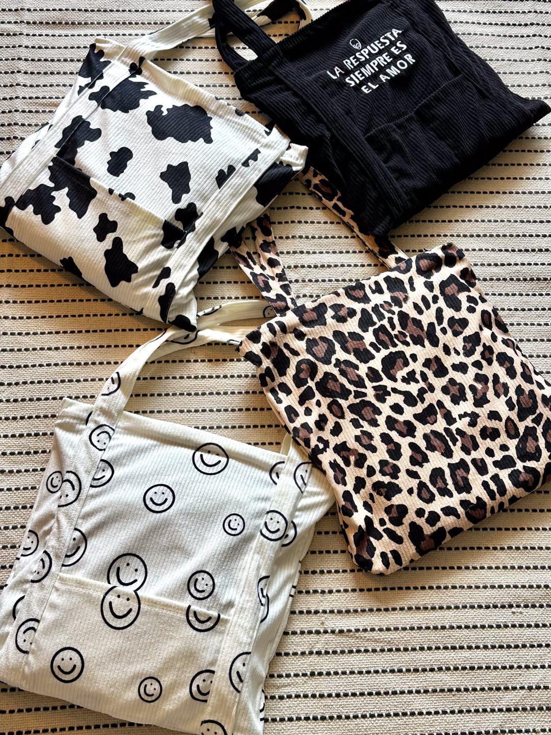 $75.000Esta tote bag es el accesorio perfecto y con estilo que buscabas, es practica y segura. Cuenta con cierre lo que hace que sea mas segura, tiene un bolsillo interno pequeño. Su print de leopardo la hace muy cool, hicimos pocas unidades :). Esta elaborada en corduroy.
