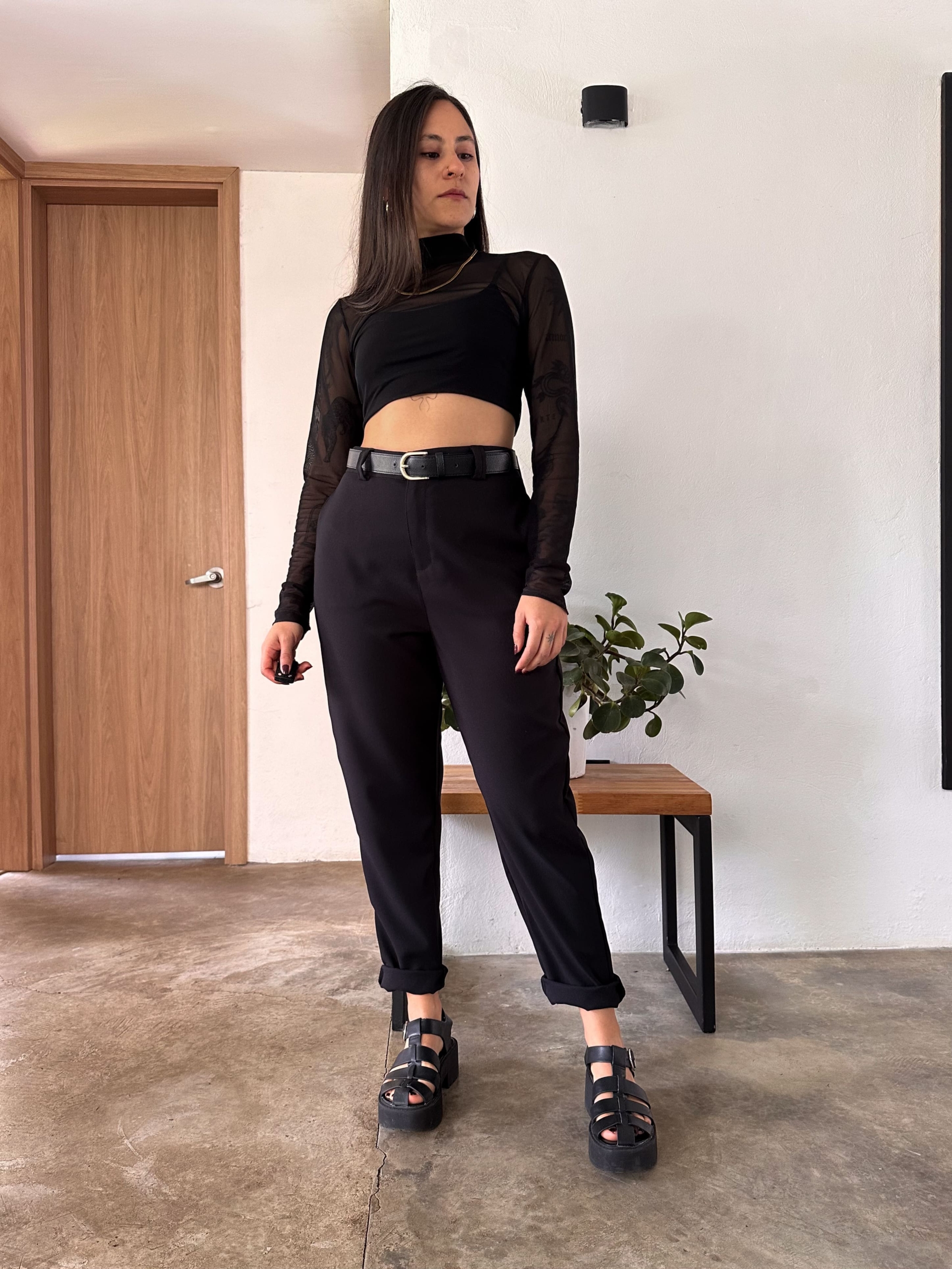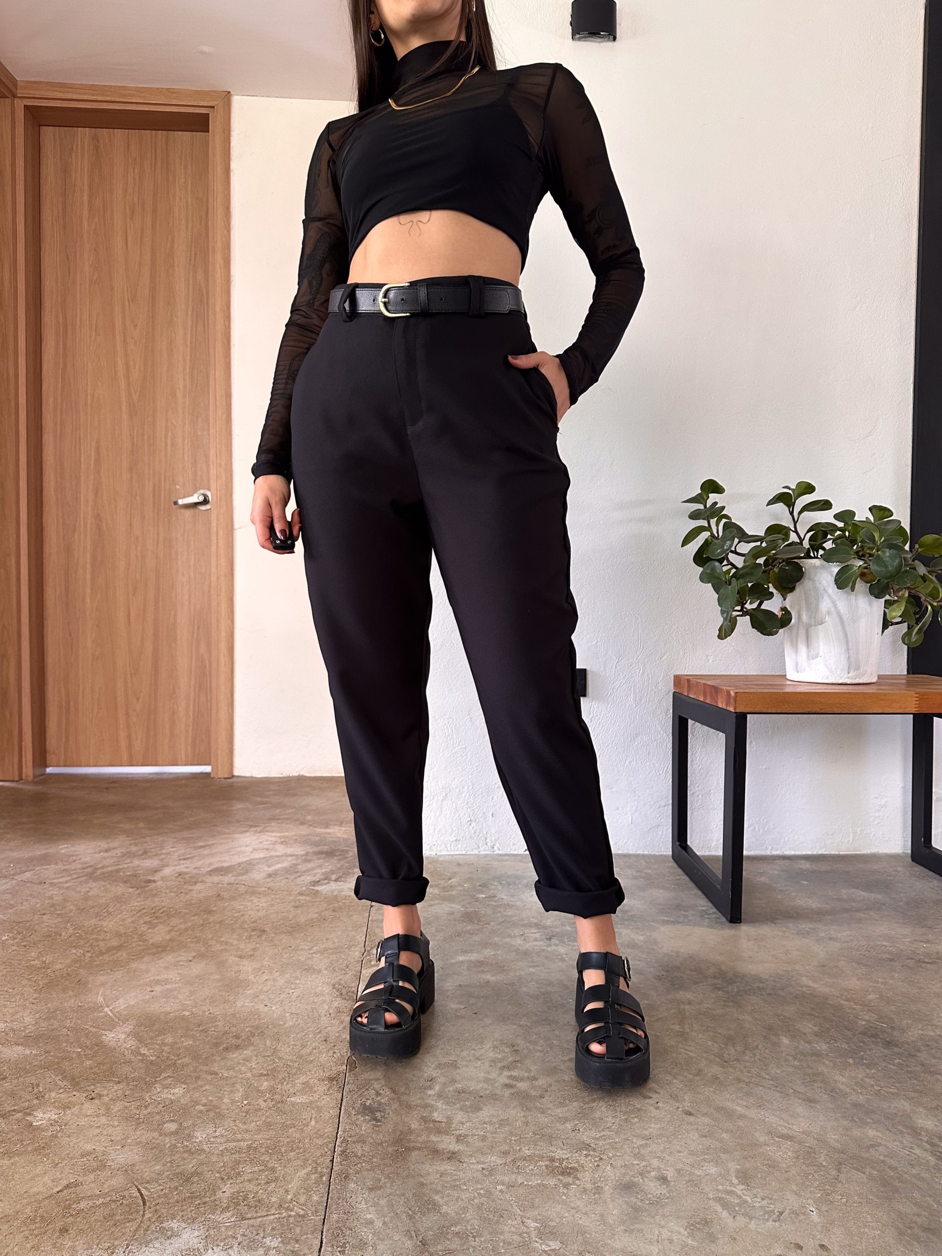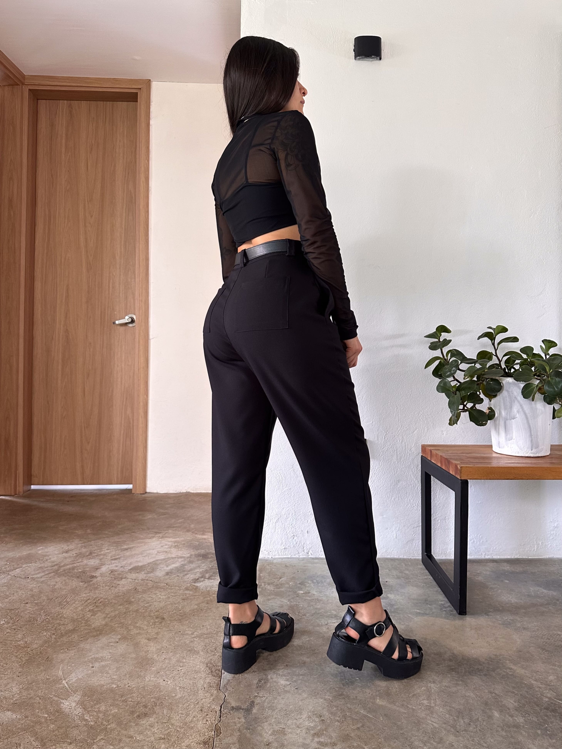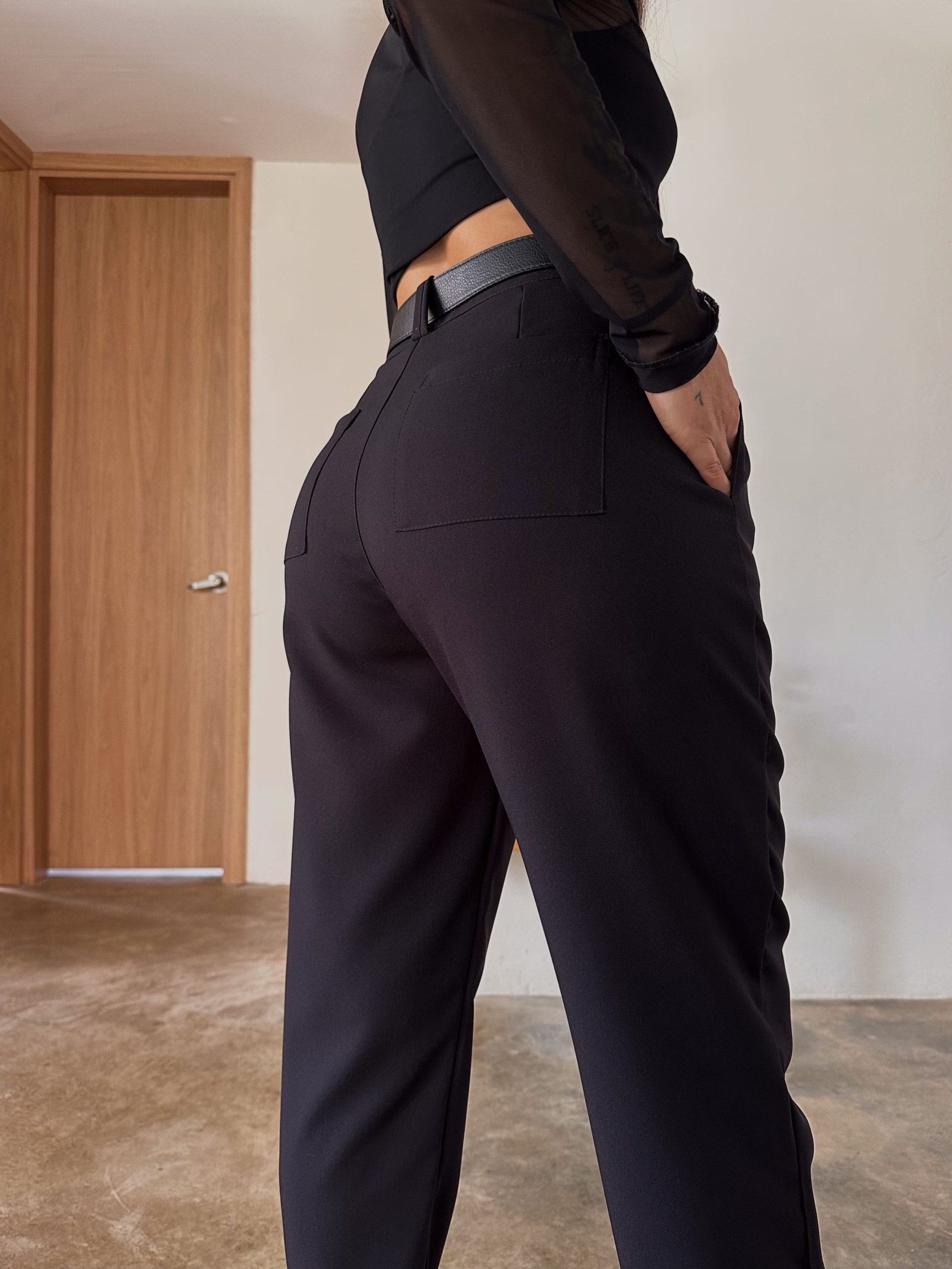Pant tiro alto, color negro, elaborado en poliester, tiene bolsillos laterales y traseros, es una prenda básica fácil de combinar, super cómodo y versátil.