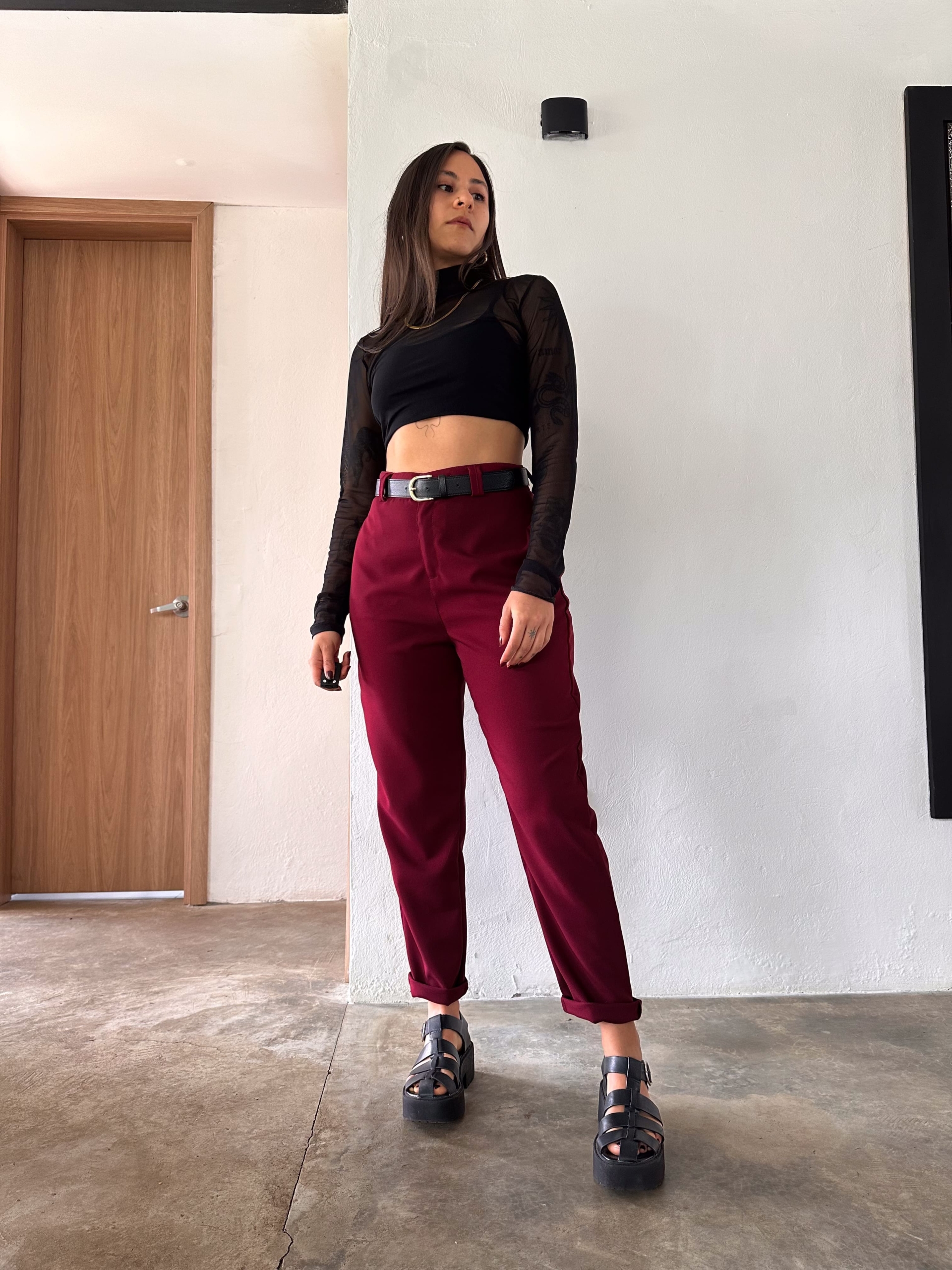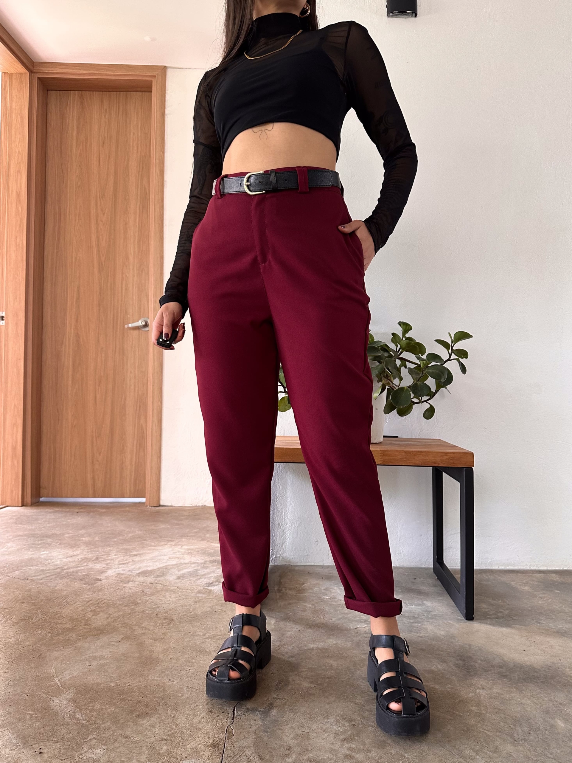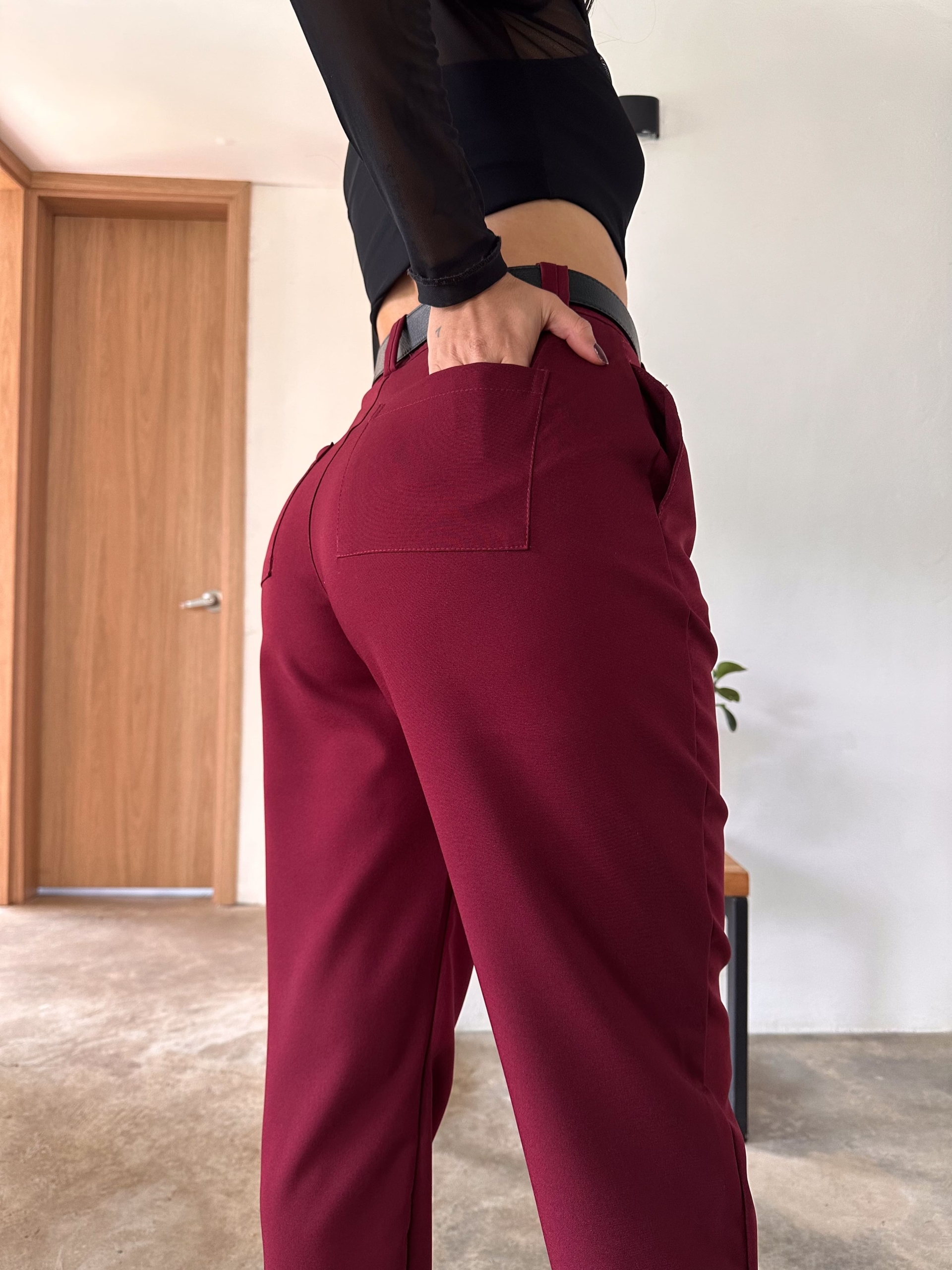Pant tiro alto, color vinotinto, elaborado en poliester, tiene bolsillos laterales y traseros, es una prenda básica fácil de combinar, super cómodo y versatil.