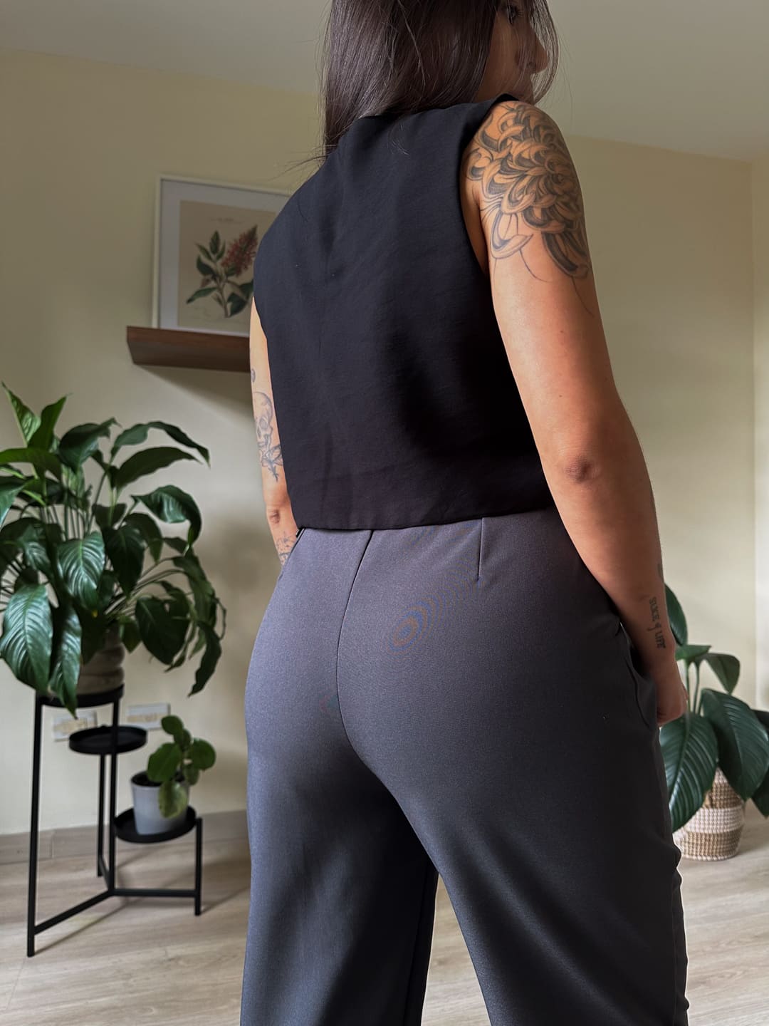$103.000Pant tiro alto, color gris oscuro, elaborado en poliester, tiene bolsillos laterales con curva, es una prenda básica fácil de combinar y super cómodo. La tela tiene poca elasticidad